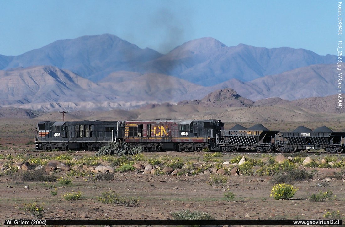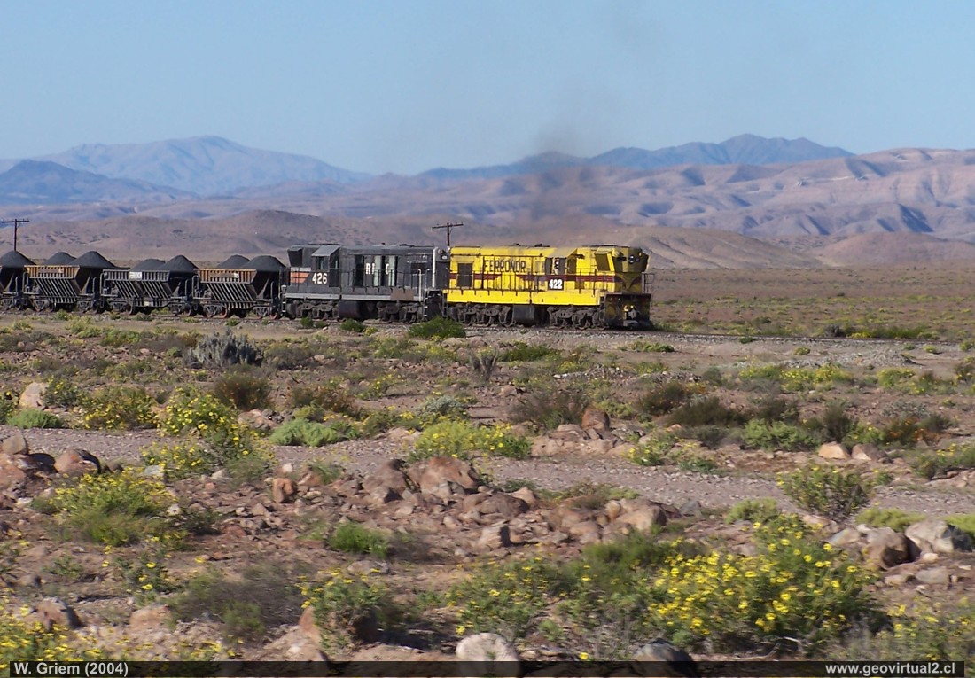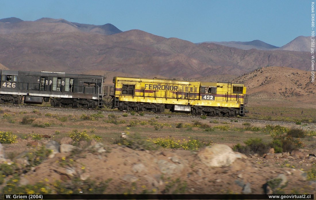 Foto: Tren en el desierto florido entre Vallenar y Copiapó, Región de Atacama; W. Griem (2004; Kodak2522): en grande