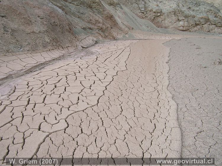 Dos avalanchas de barro (o mudflows) de diferentes fases. A la derecha - un poco más de color gris el mudflow más antiguo, en el centro - izquierda el mudflow más moderno. En ambos casos el barro se secó y se formaban grietas de resecación. Por lo menos la ultima avalancha era muy plástica con baja fluidez - los contornos y el centro de la avalancha muestran una fuerte morfología.