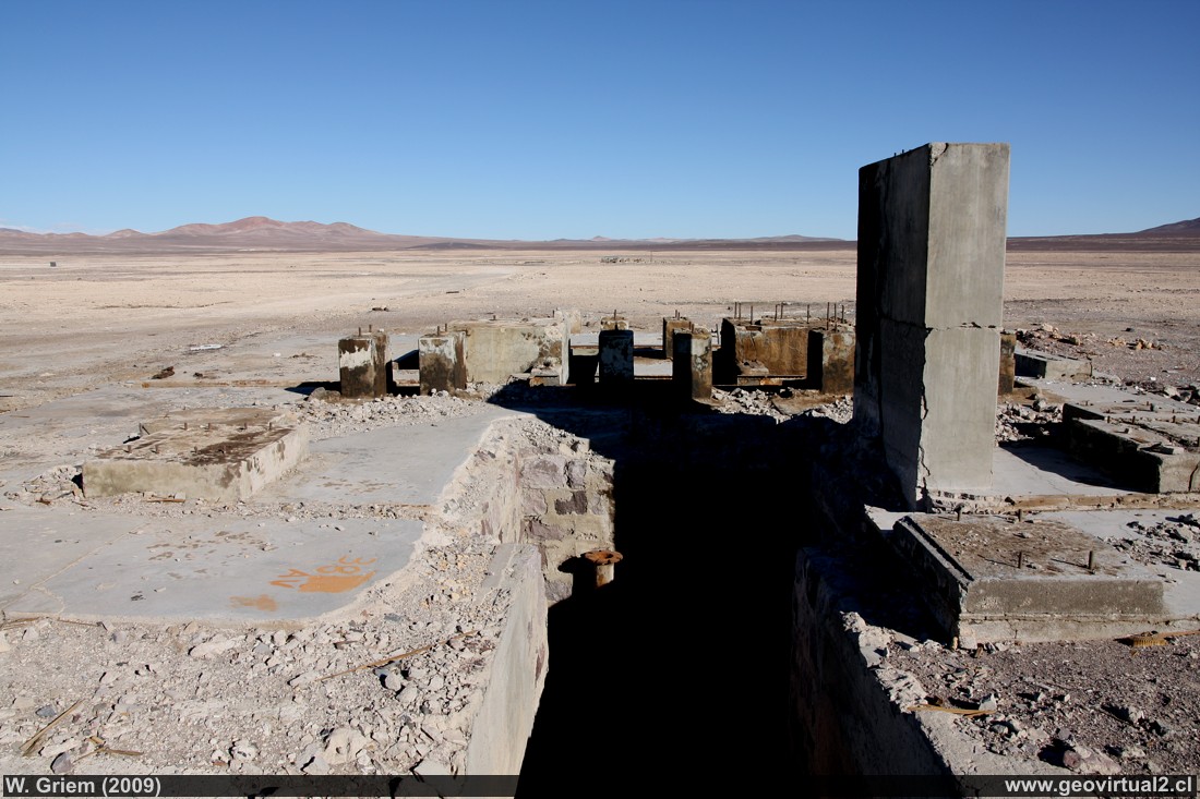 Foto: Der Tiefbrunnen und die Grundmauern der Pumpe in der Salpetermine Severin - Atacama, Nordchile. (CaXSi3029; W. Griem 2009) - Foto in groß