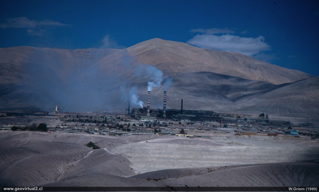 Potrerillos um 1989 - Die Kupferschmelze und die noch aktive Kleinstadt. - Der Norden von Chile; Foto W. Griem (1989; dig2005) Foto in groß