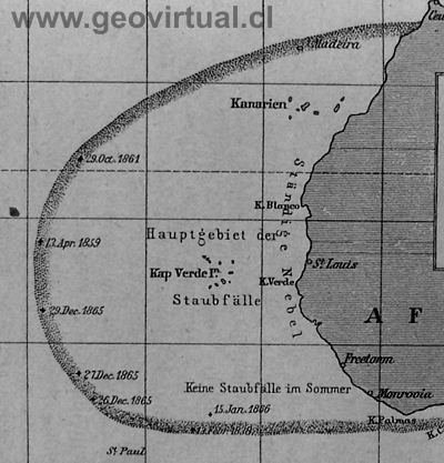 Original en alemán: Nordatlantischer Ozean - Verbreitung der Staubfälle