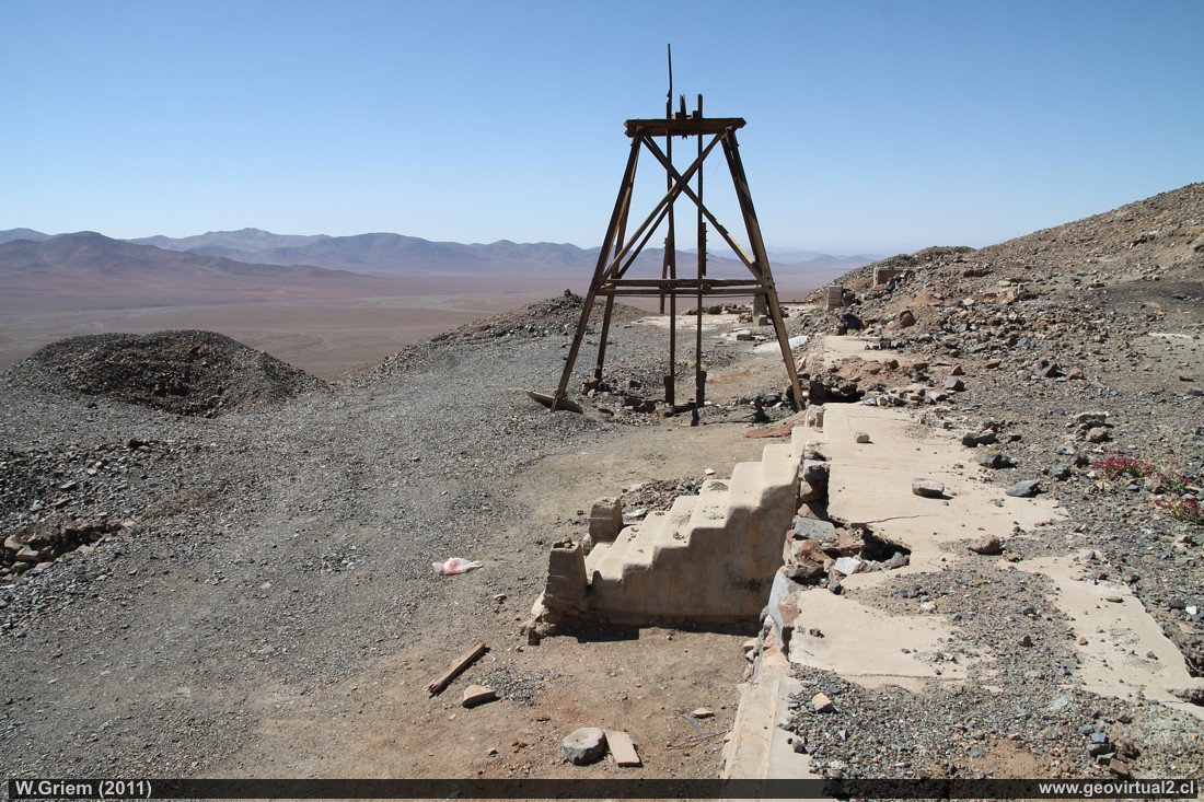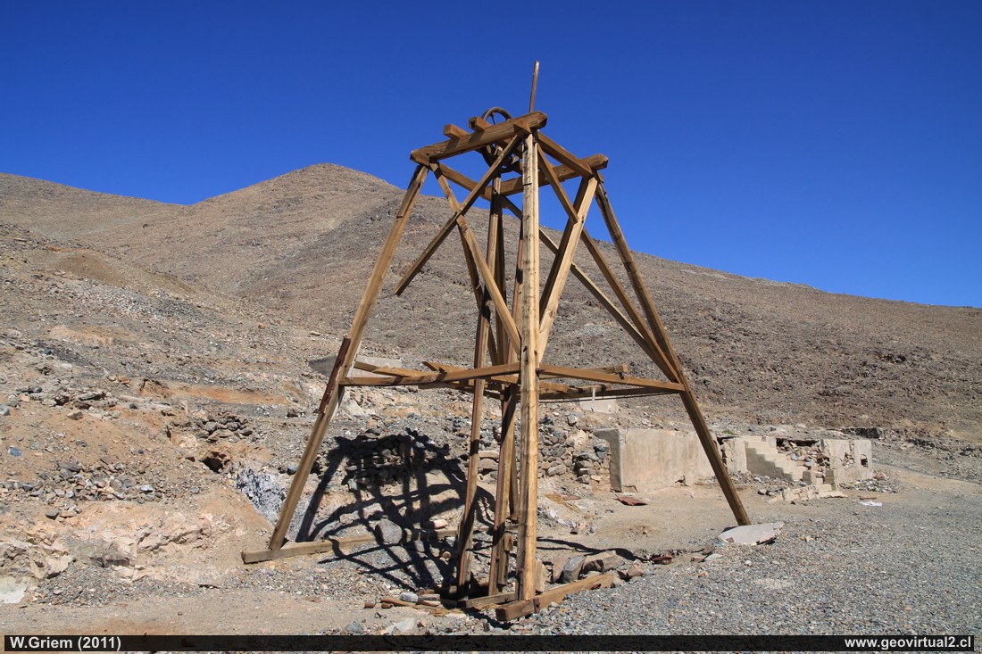 Foto: Peinecillo (castillete) de madera de la mina Sonia Bajo - Inca de Oro de la Región de Atacama, Chile. (Foto W.Griem, 2011; Ca50D0363) - en grande